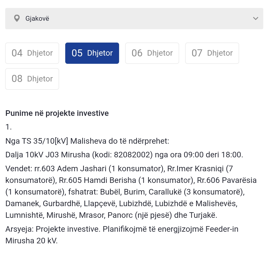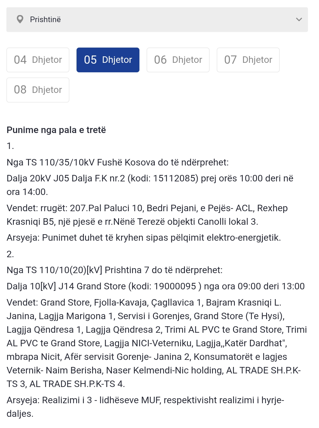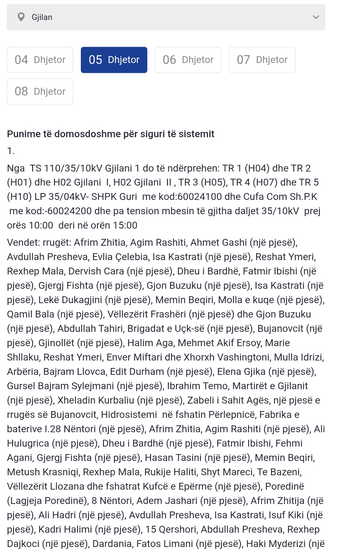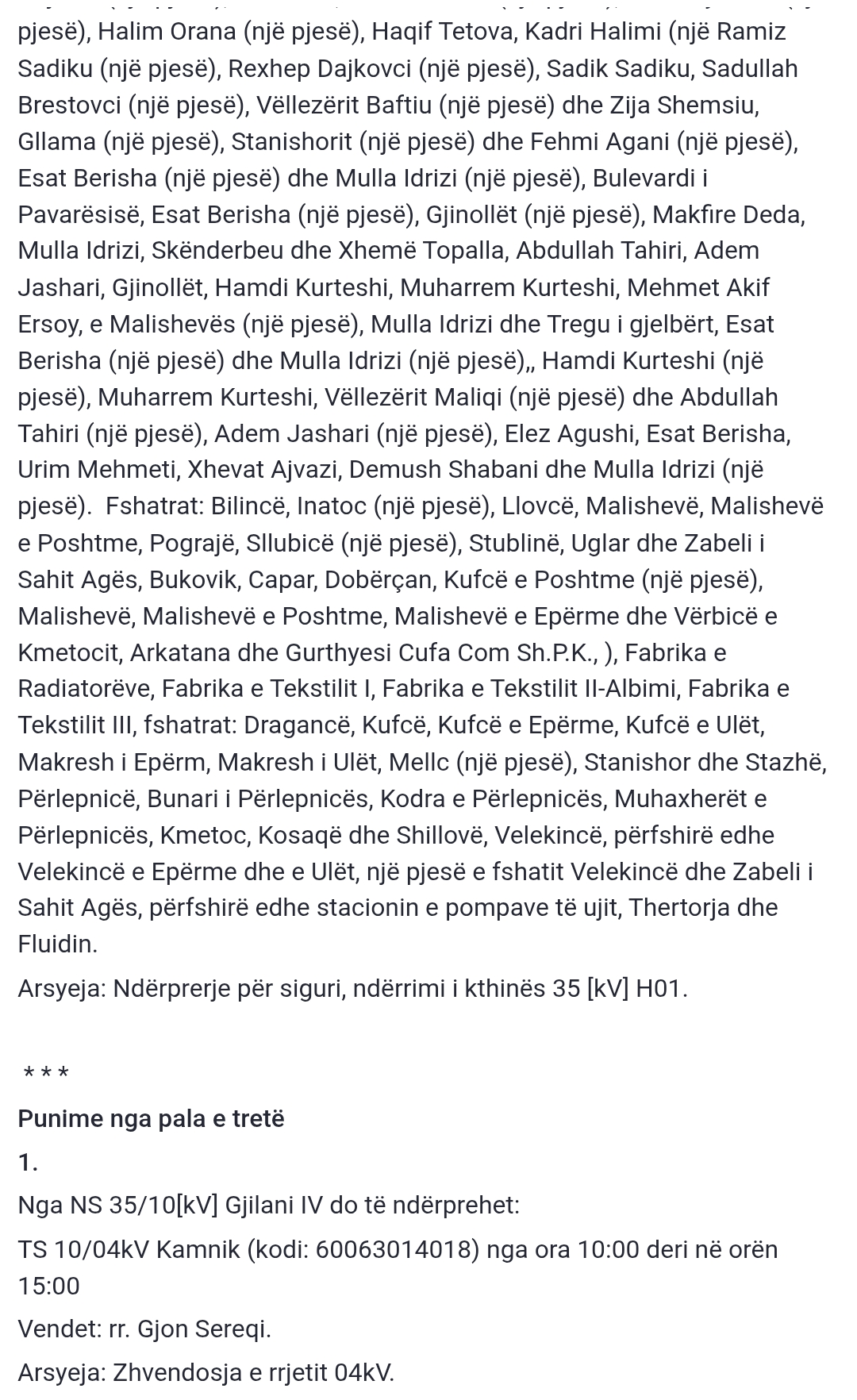 Më poshtë lista e plotë e vendeve që mbesin pa rrymë:
