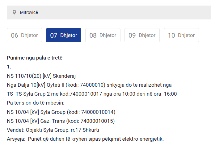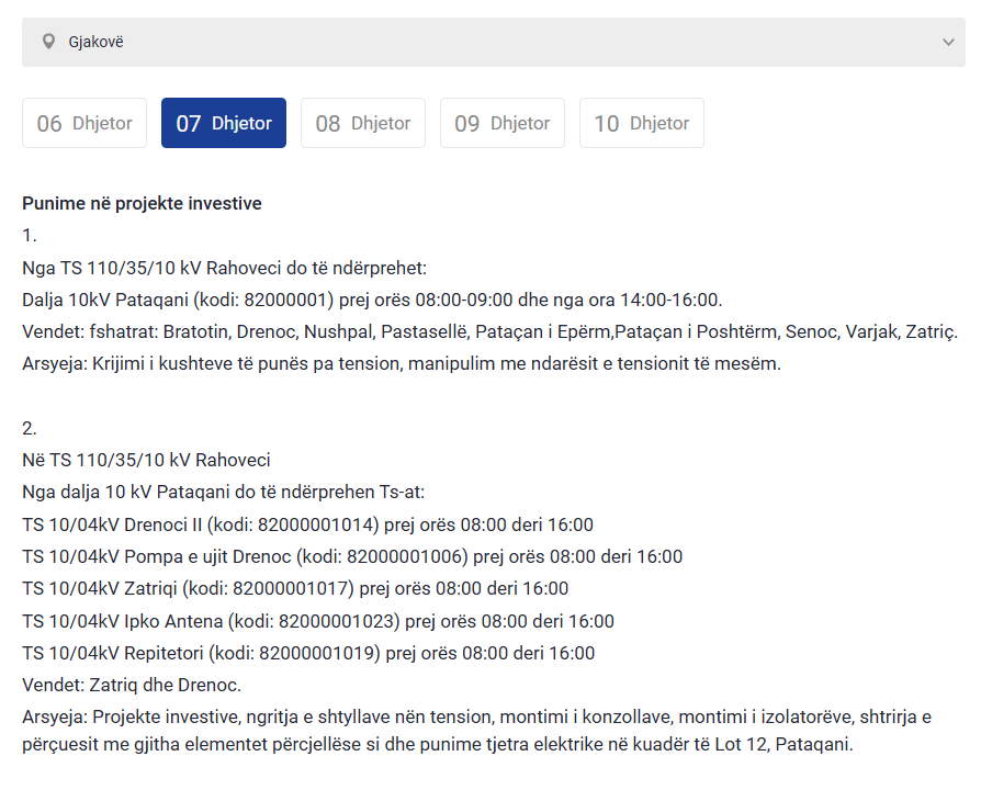 Më poshtë lista e plotë e vendeve që mbesin pa rrymë: