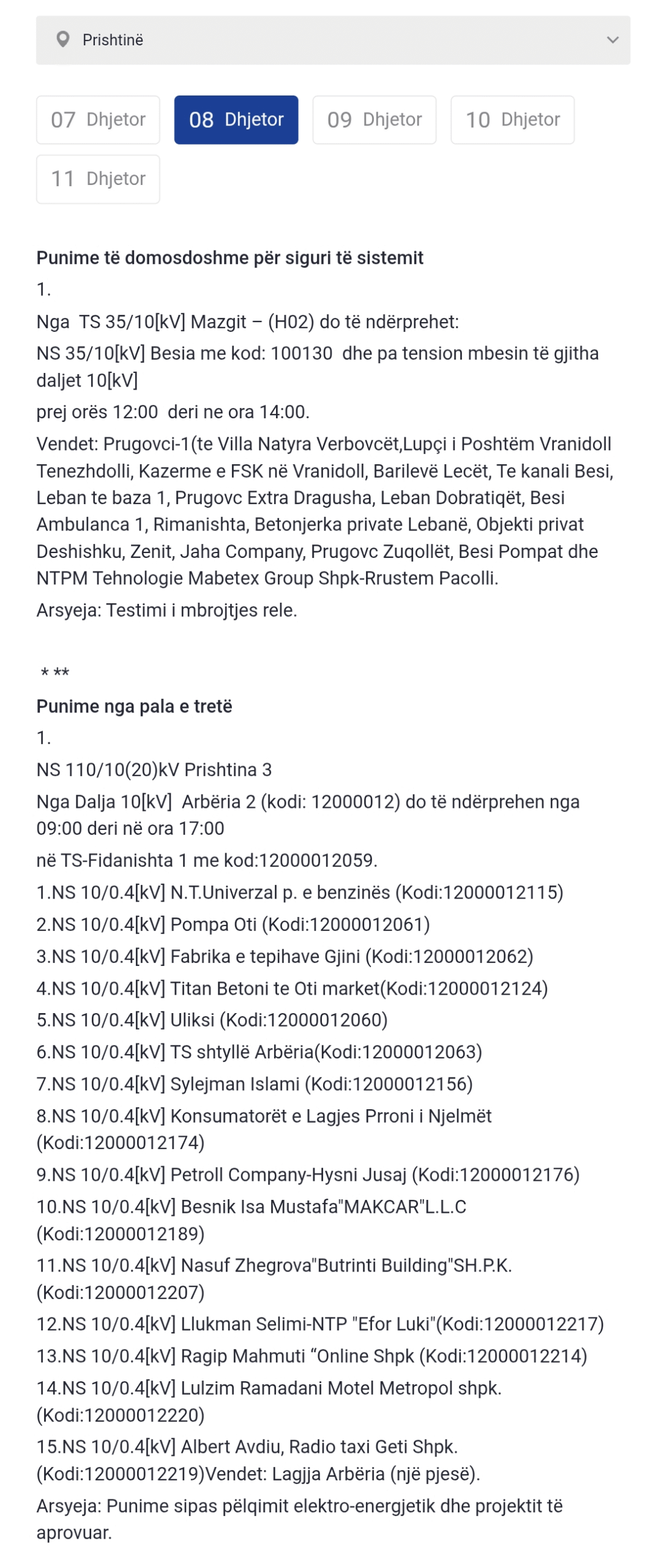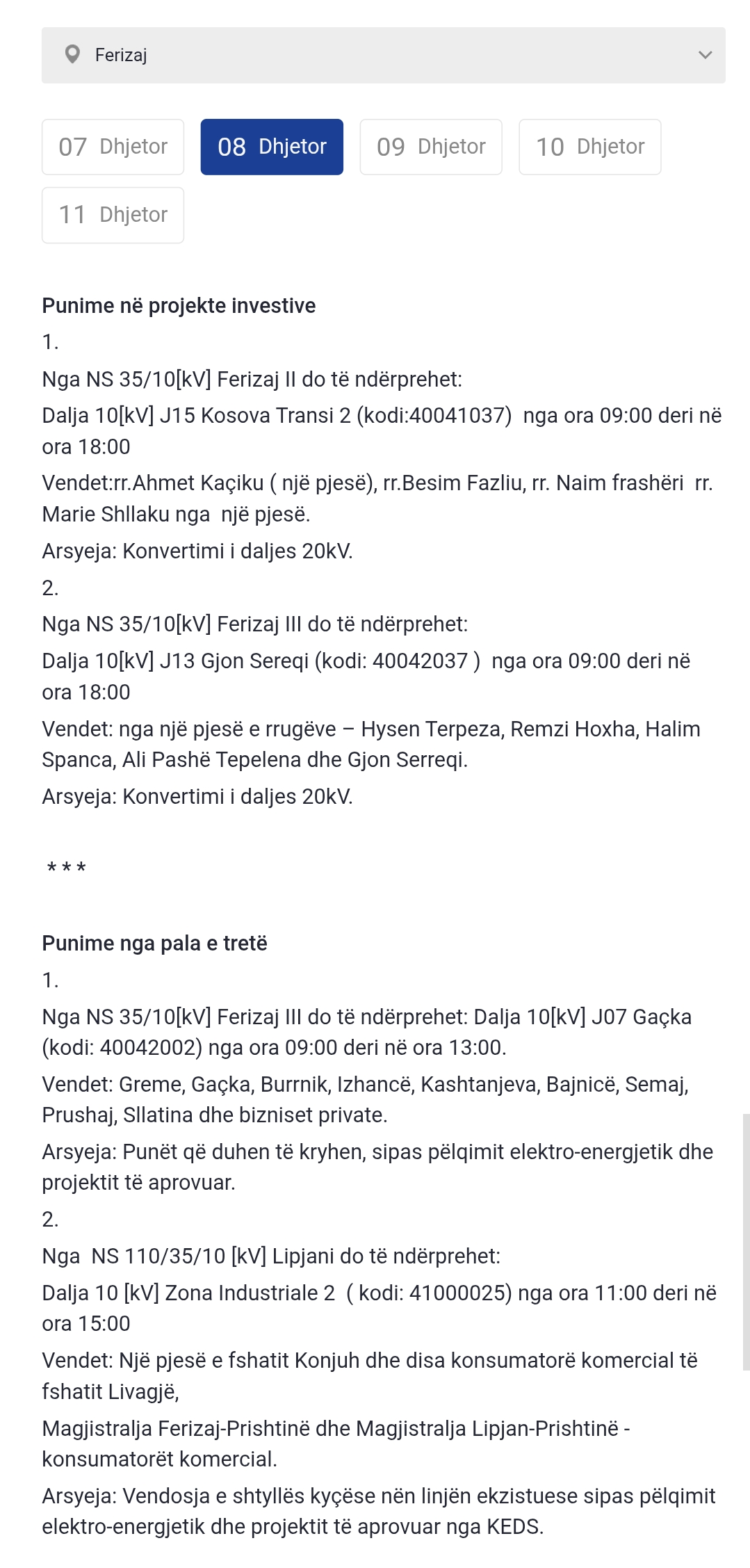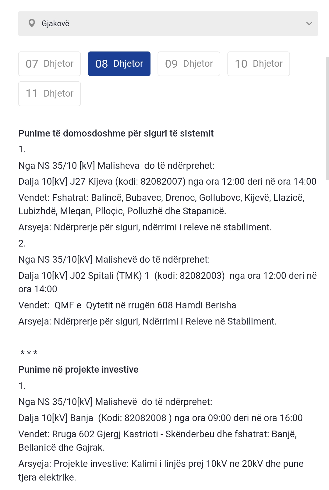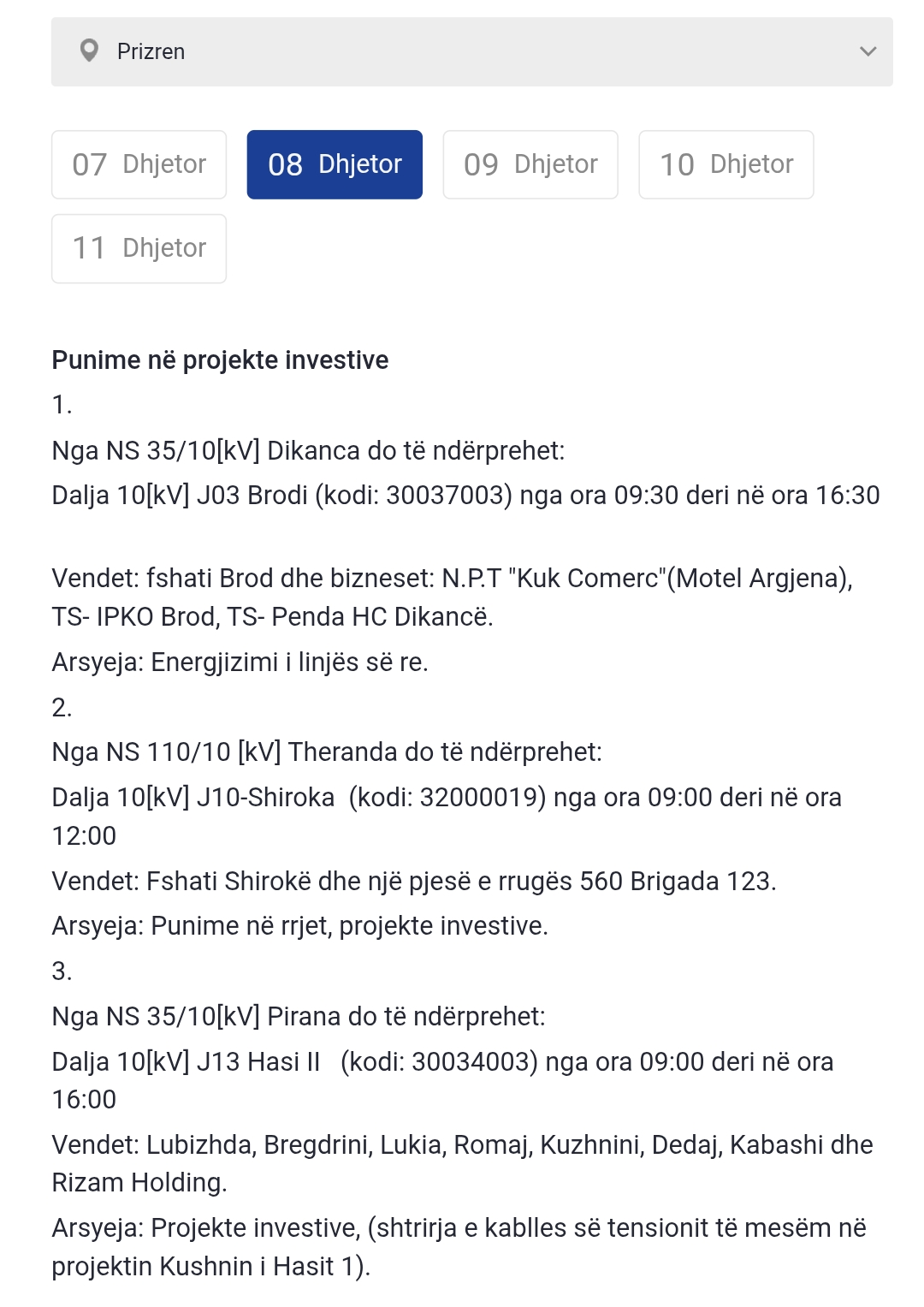 Më poshtë lista e plotë e vendeve që mbesin pa rrymë: