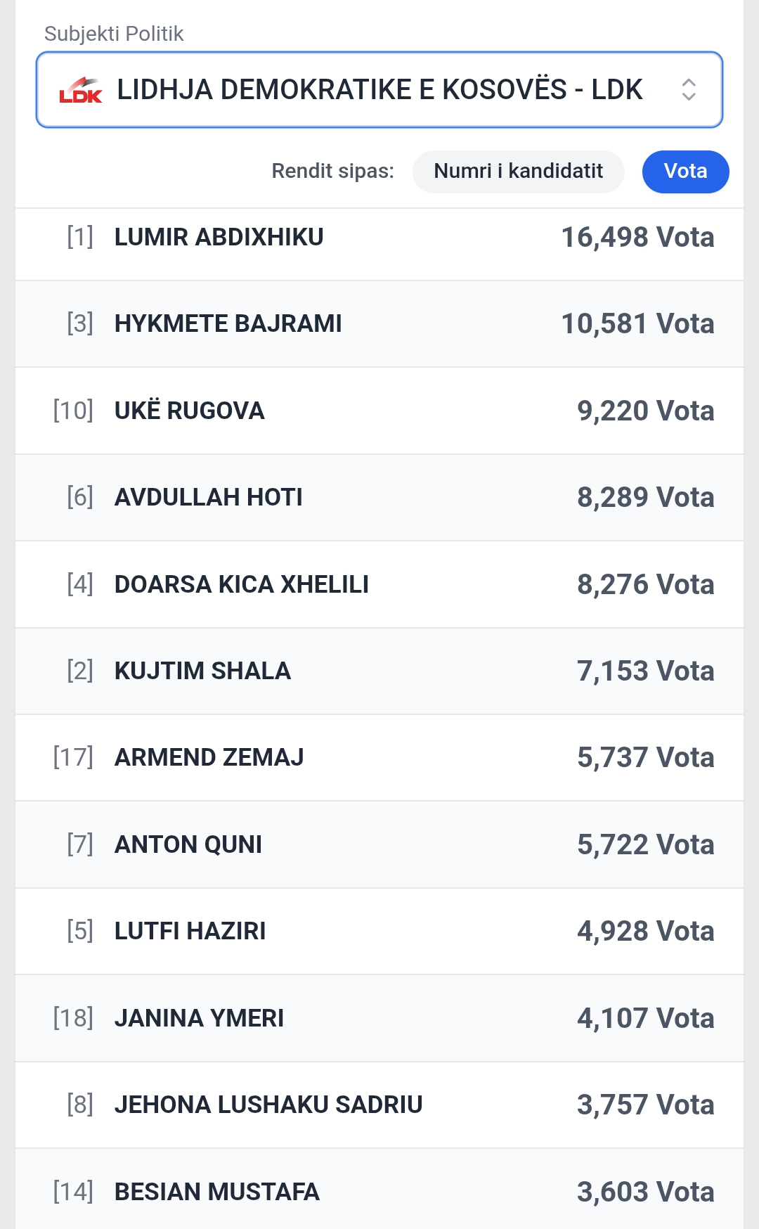 Më poshtë renditja e më të votuarve nga LDK: