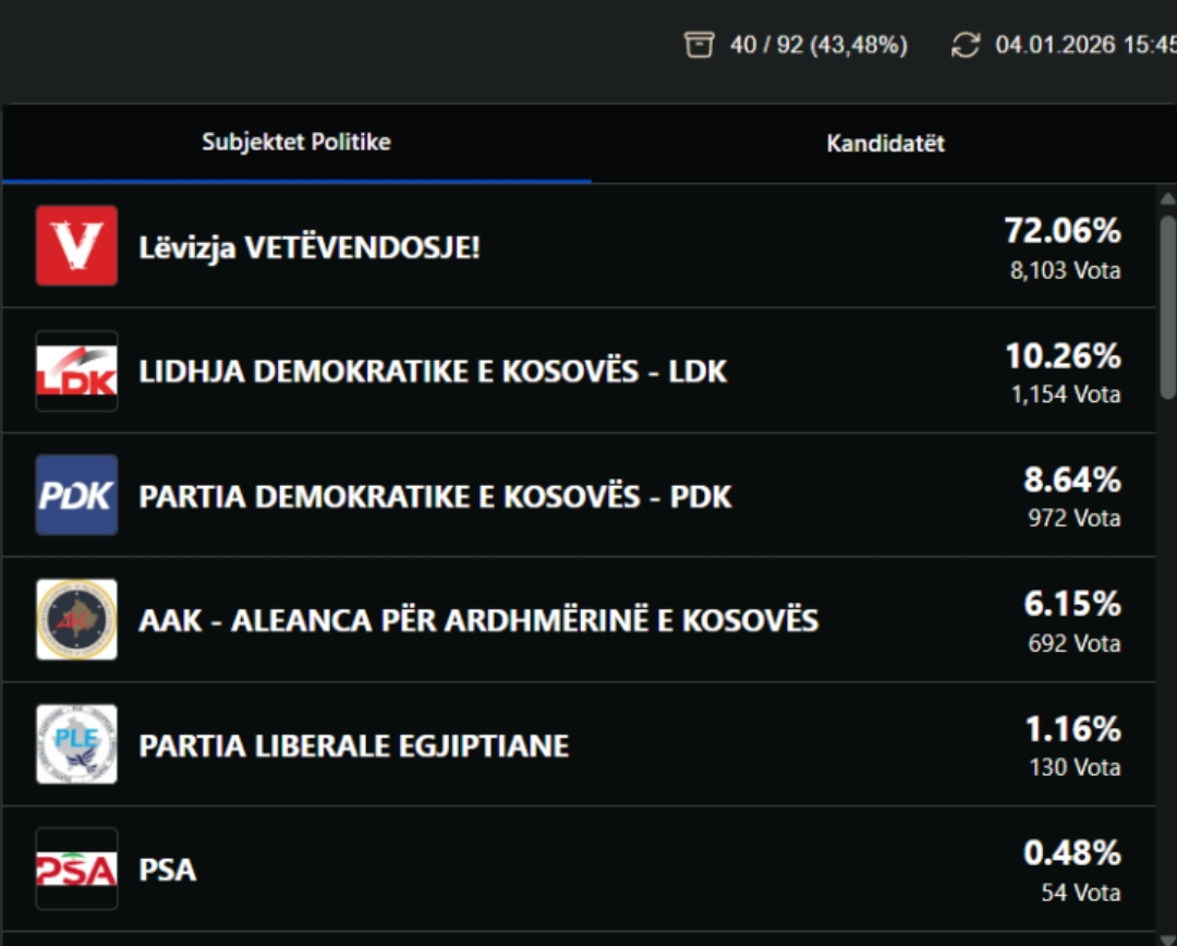 Sipas përditësimit të fundit të orës 15:45, janë procesuar 40 nga 92 njësive (vendvotimeve) të votave me postë, që përbën 43.48% të totalit