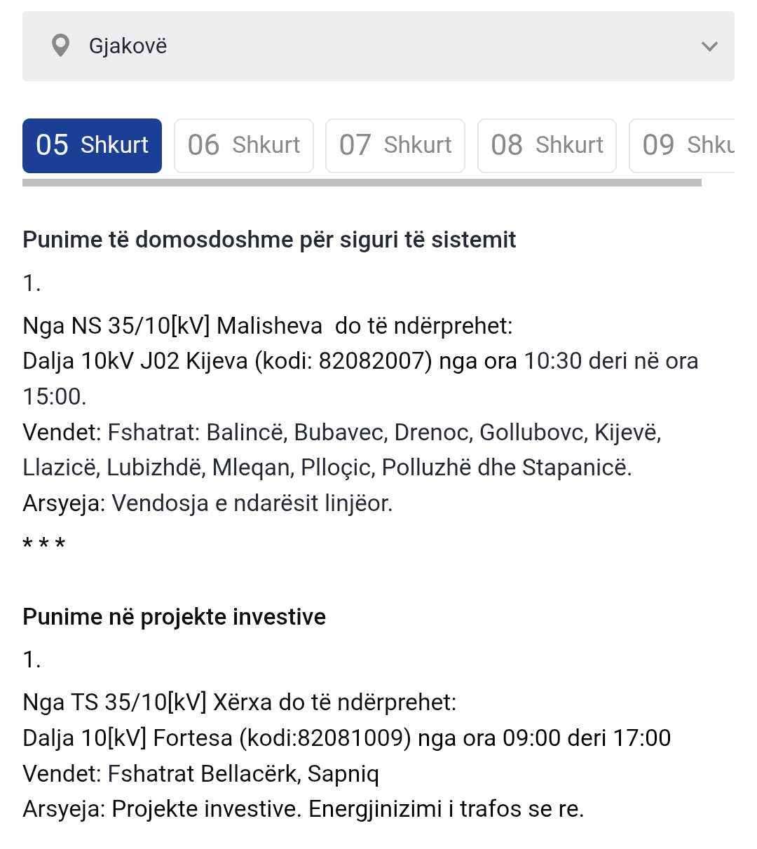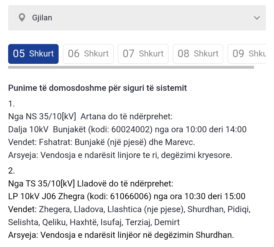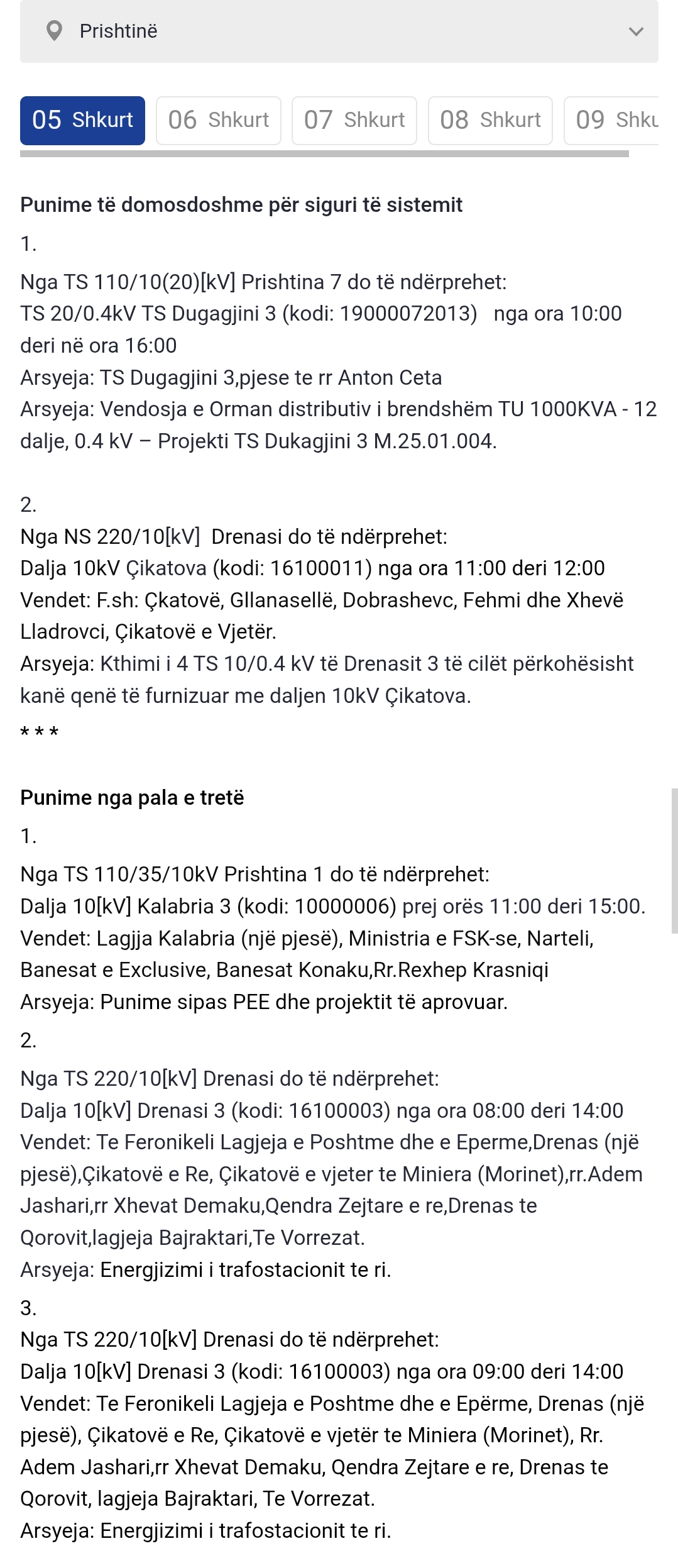 Më poshtë lista e plotë e vendeve që mbesin pa rrymë:
