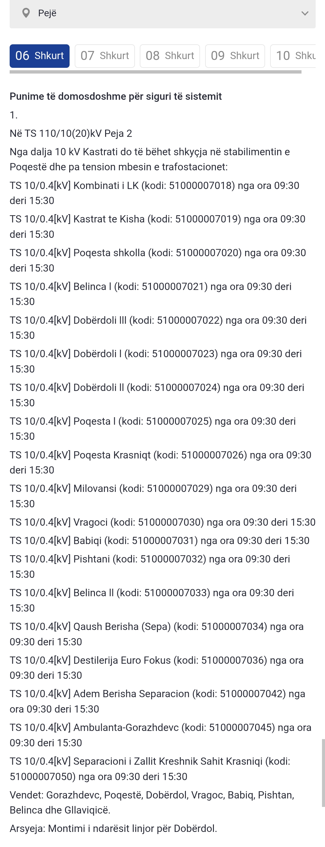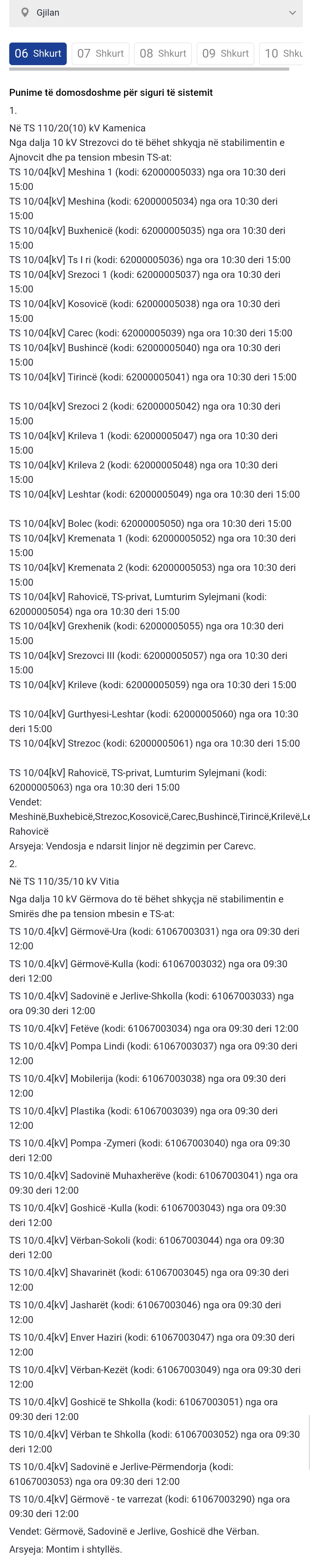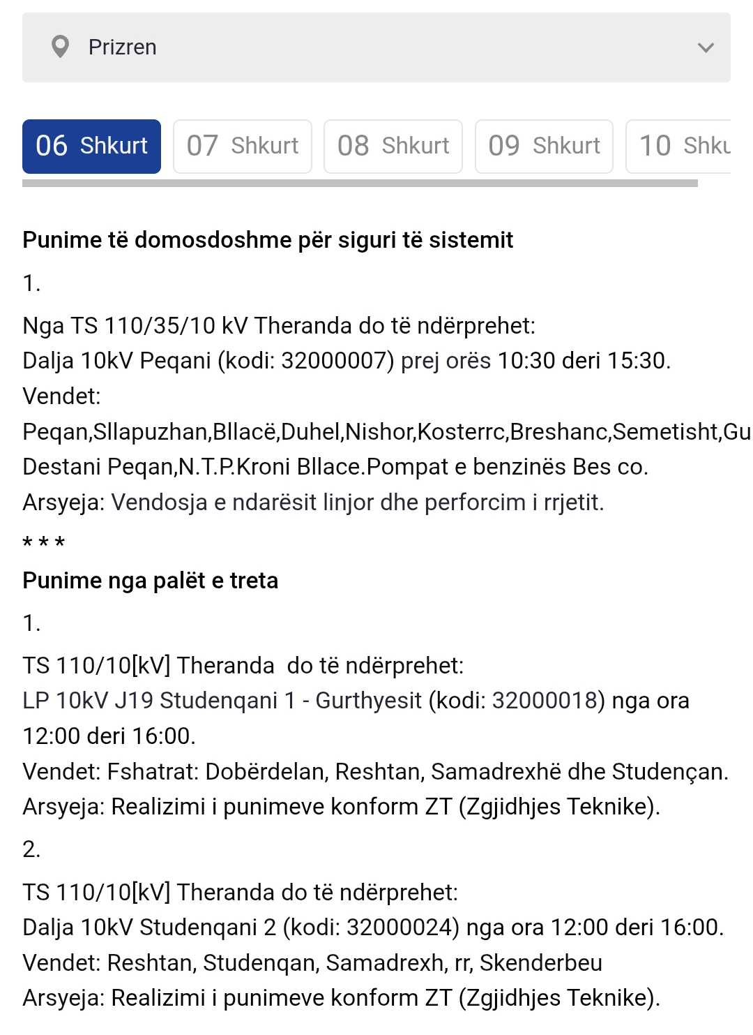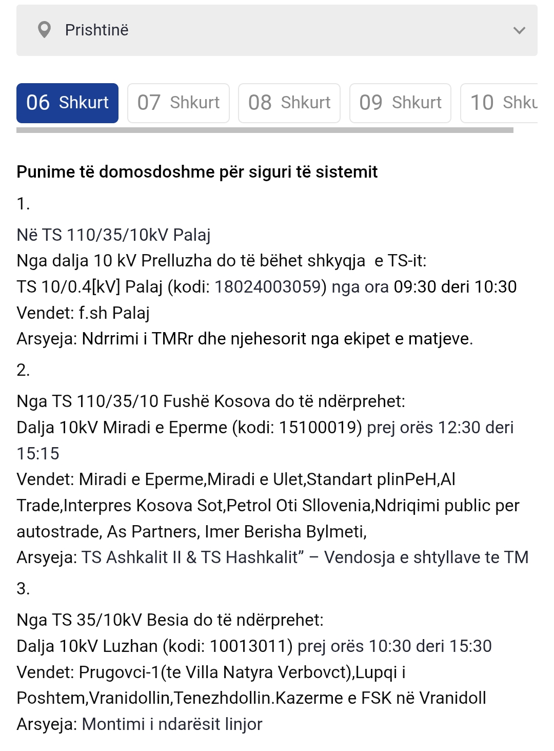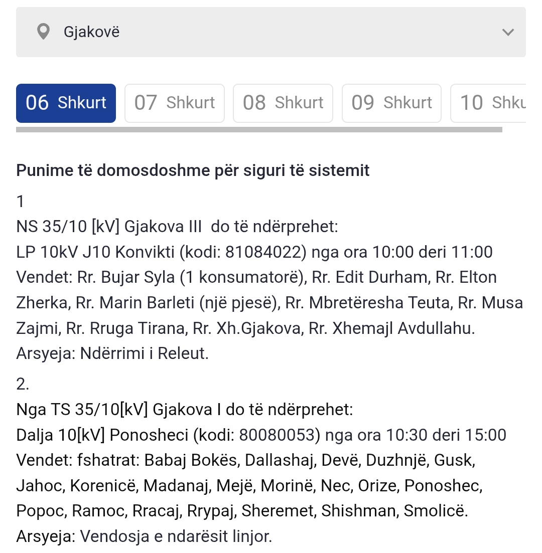 Më poshtë lista e plotë e vendeve që mbesin pa rrymë: