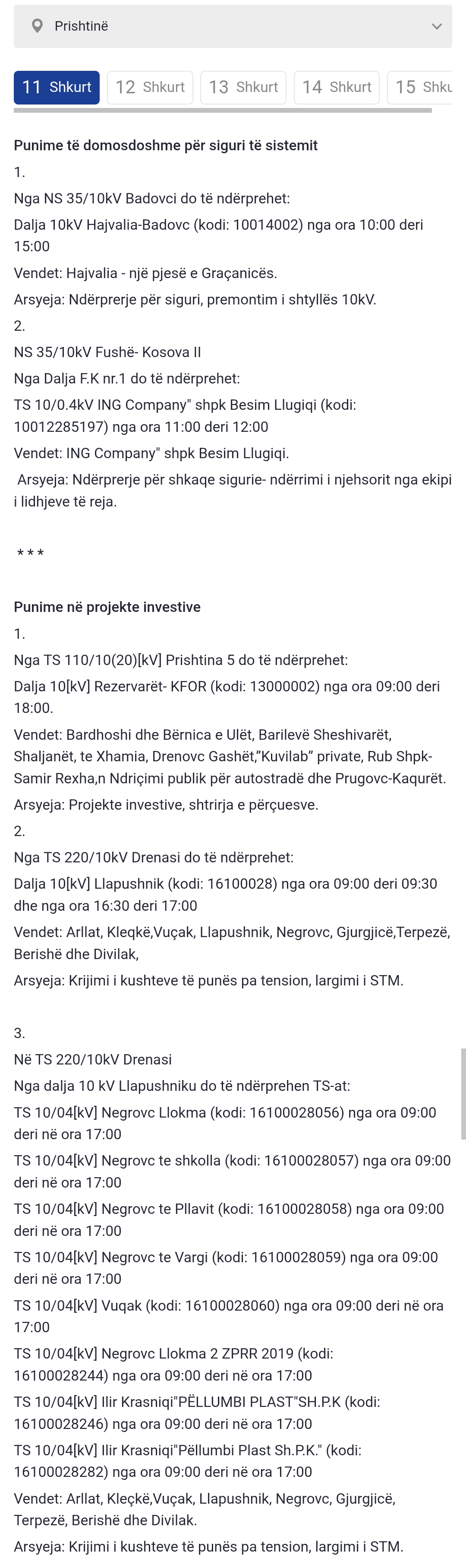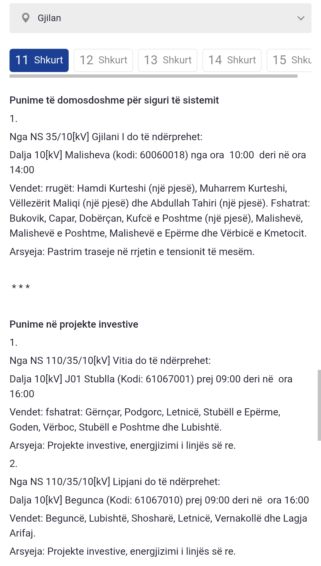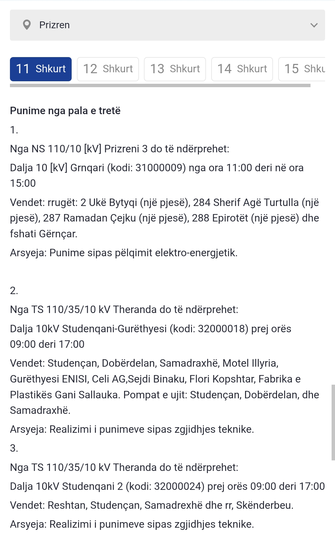 Më poshtë lista e plotë e vendeve që mbesin pa rrymë: