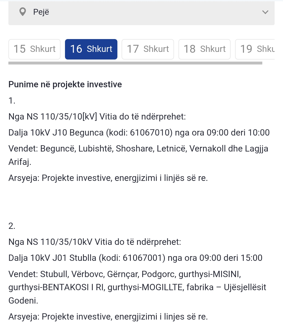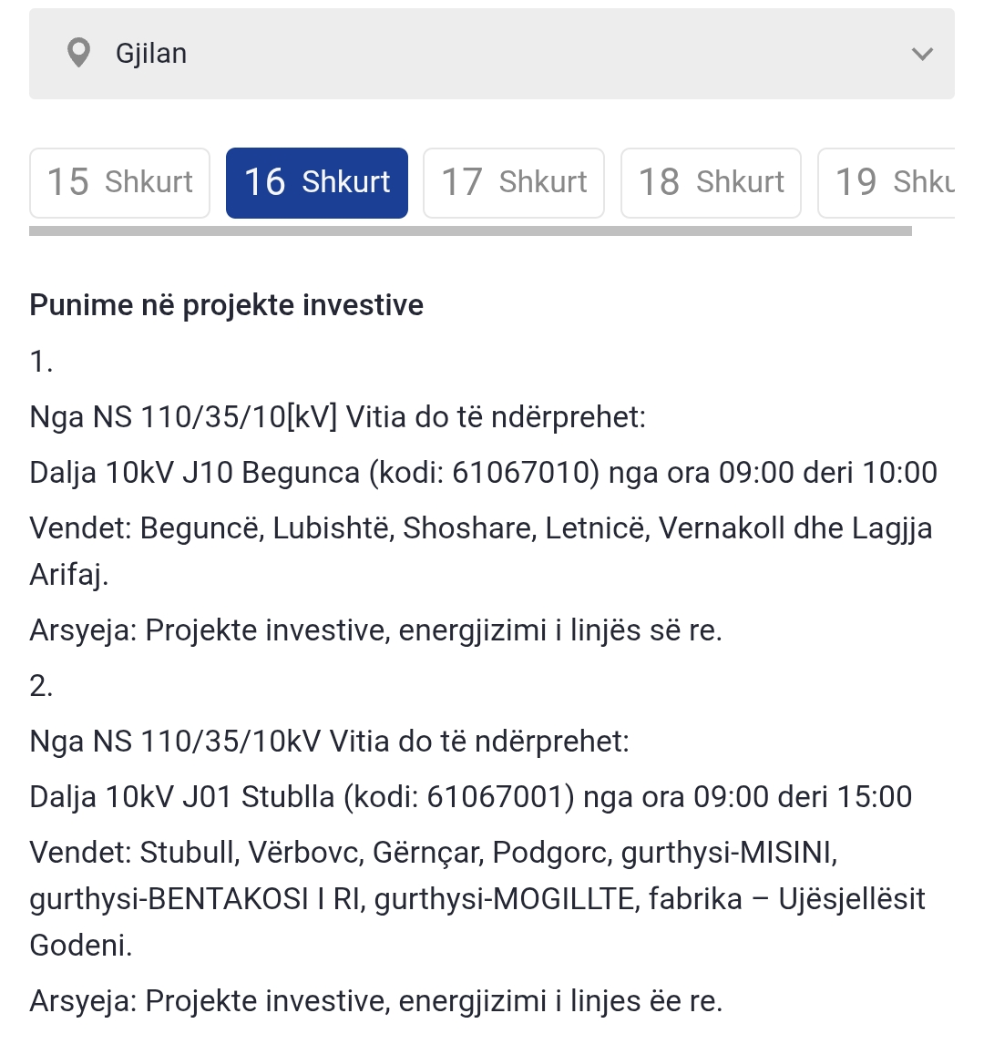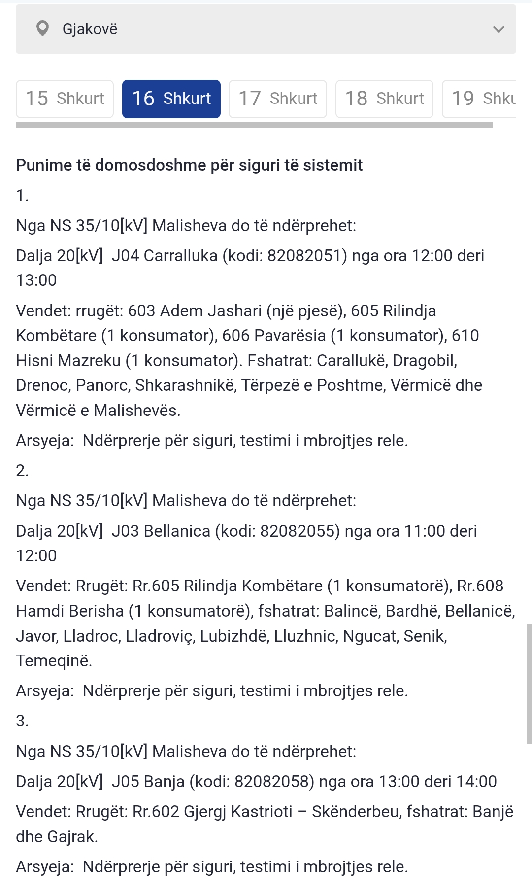 Më poshtë lista e plotë e vendeve që mbesin pa rrymë: