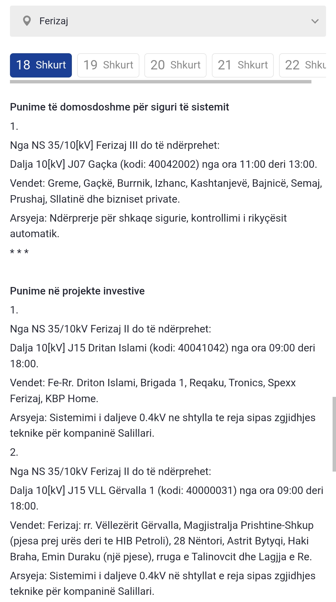 Më poshtë lista e plotë e vendeve që mbesin pa rrymë: