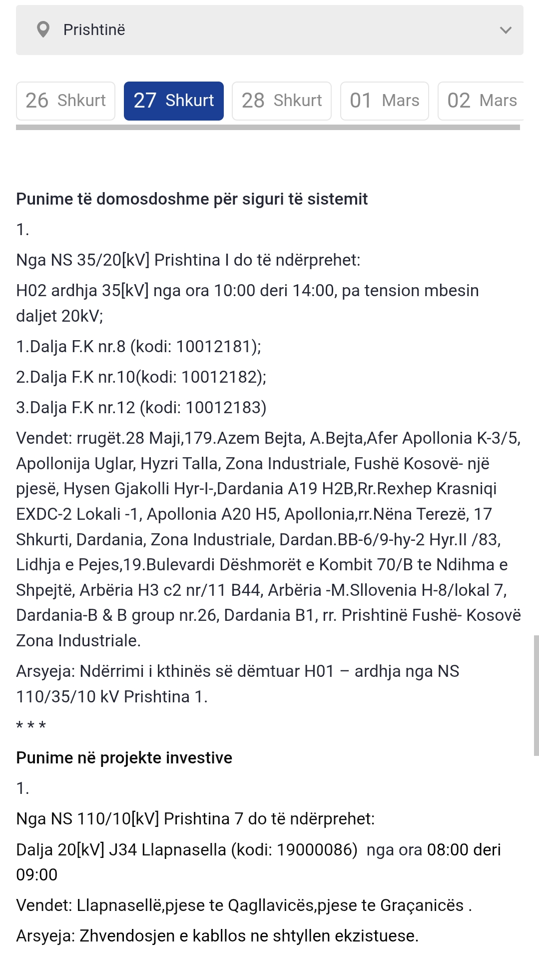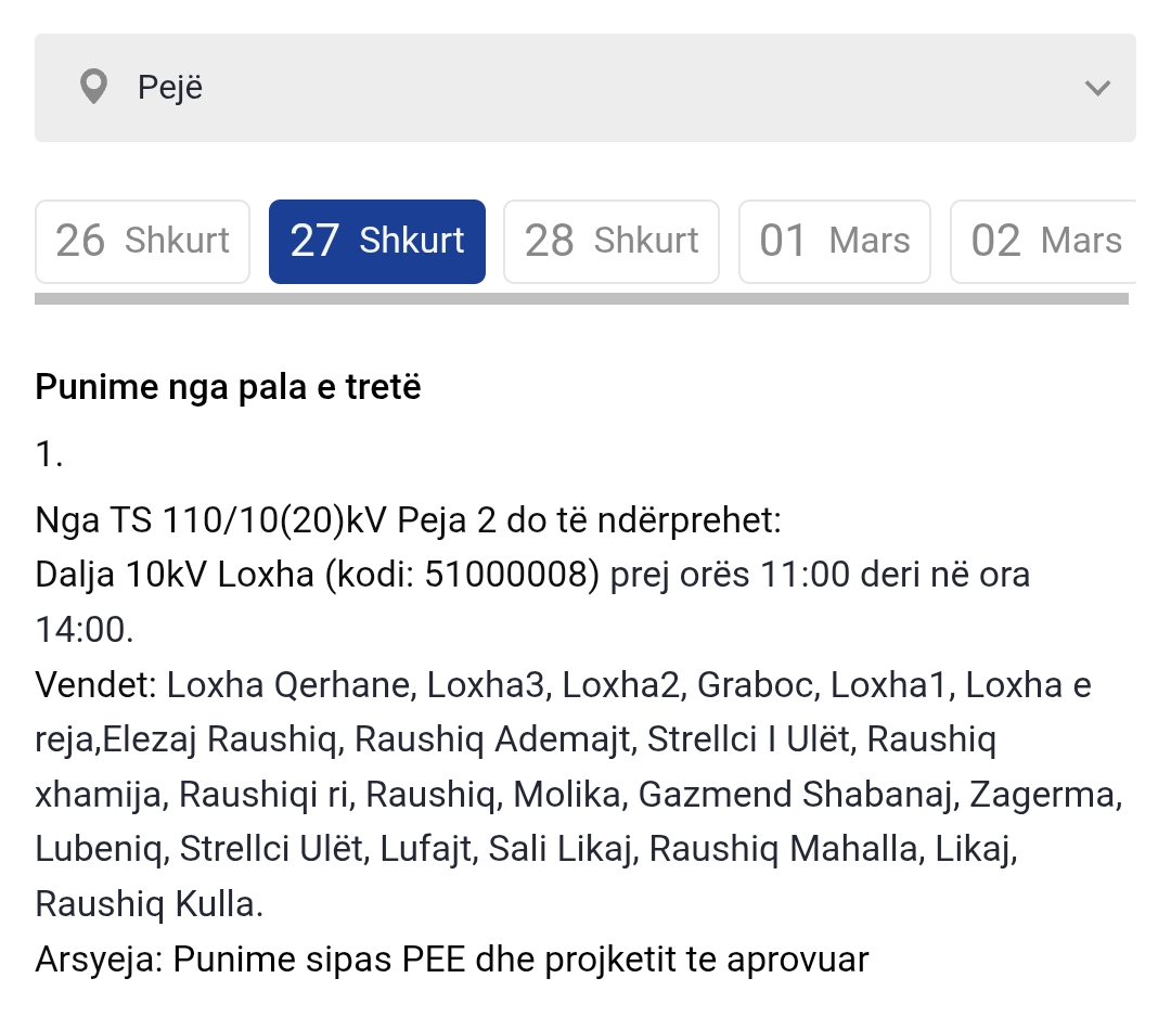 Këto vende të Kosovës do të mbesin pa rrymë (e premte, 27.02.2026)
